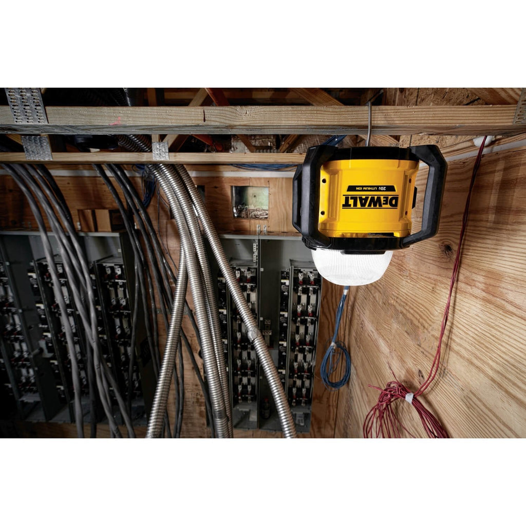 Our Tool Connect All-Purpose Cordless Work Light lights up the jobsite. This LED work light is compact and portable so it's convenient for everyday tasks, and it's bright enough to light large areas. Powerful, efficient LED technology produces up to 5000 lumens of natural white light, without the heat and hassle of halogen. The All-Purpose Light can be used freestanding, tripod mounted (sold separately), or hung with a convenient integrated hook. The light works with all DEWALT 20V MAX and FLEXVOLT batteries, with up to 11 hours of runtime for a full day of work. Also, use the free Tool Connect app to control and monitor your LED rechargeable work lights remotely on the jobsite. Plus, its impact resistant body and lens, and a 3-year limited warranty, it will stand up to your tough jobsite environments.