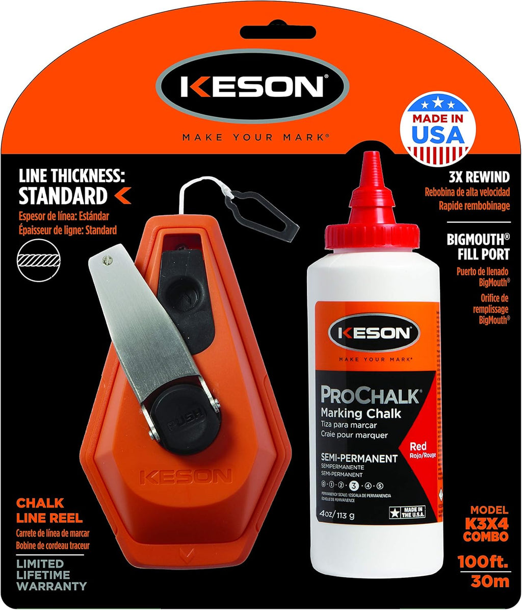 Keson chalk line reel with flush handle and patented wedge shape enables easy in and out of tool pouch. 3x rewind with clutch release for fast line pay out and retrieval. Metal rewind Arm and tough ABS case. It is similar in size to a felt tip pen line. Keson twisted synthetic line picks up and puts down more chalk than our precision line. There is a bit of over-spray on the lines. Also included is a 8 oz bottle of red ProChalk Marking Chalk.