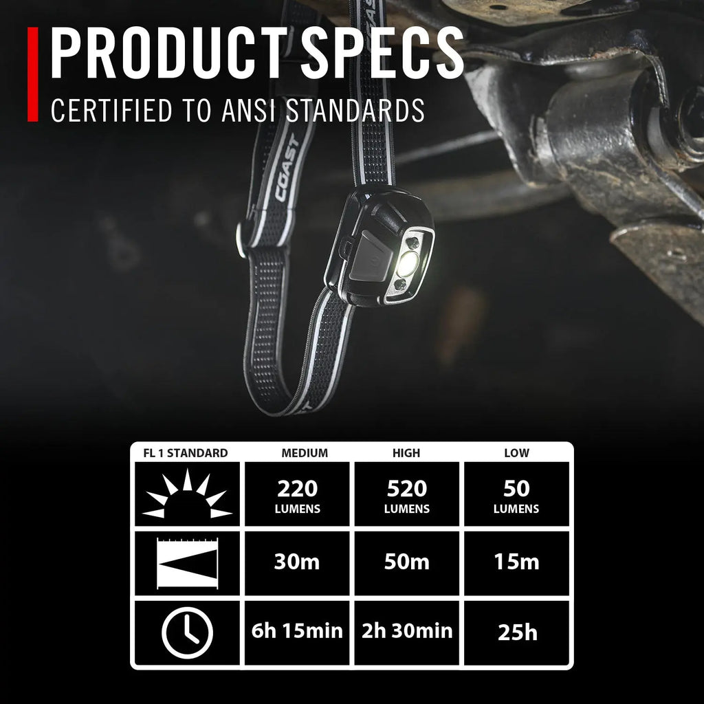 Do more with less. The FL20R rechargeable headlamp makes compact hands-free lighting even more useful with dual color LEDs and the COAST Ultra-Strap which enables the headlamp to be worn, hung, or strapped to structures. The white Wide Angle Flood Beam shines in three modes—medium, high, low—and the anti-glare red LEDs prevent night blindness and reduce the headlamp’s visibility in the surroundings. With a 25-hour run time on low, this Dual Power headlamp is powered with an embedded rechargeable lithium-ion battery. Practical features include an anti-slip, silicone-lined head strap, a hinged beam for directional lighting, and an IP54 dust resistant and storm proof build.