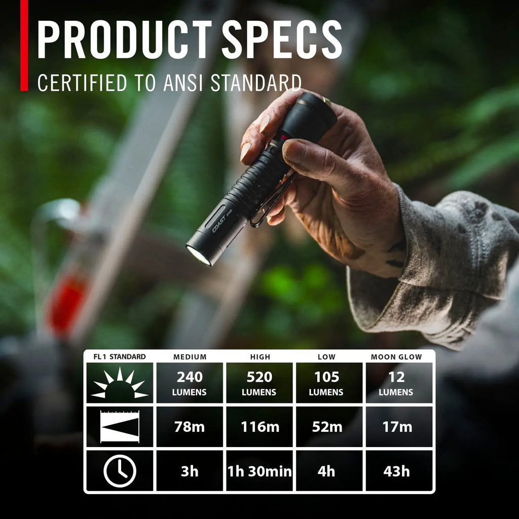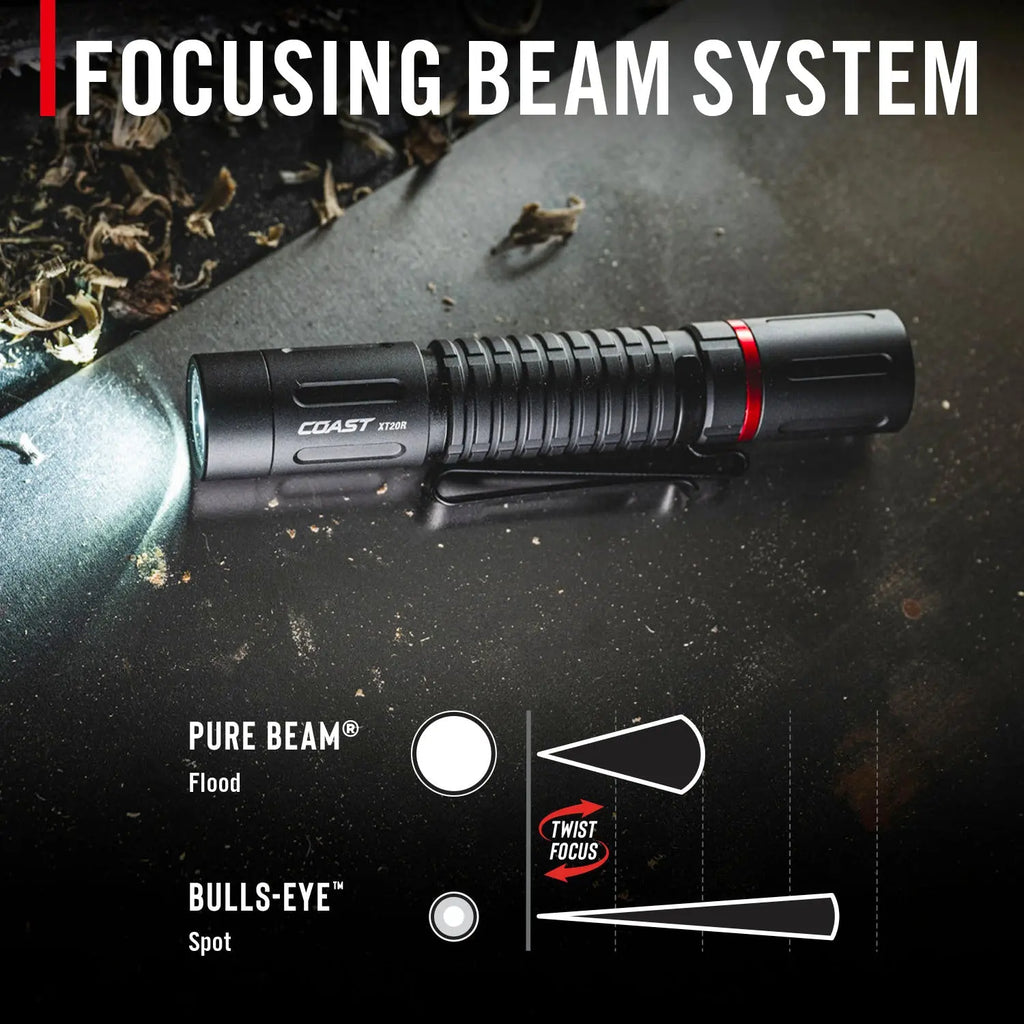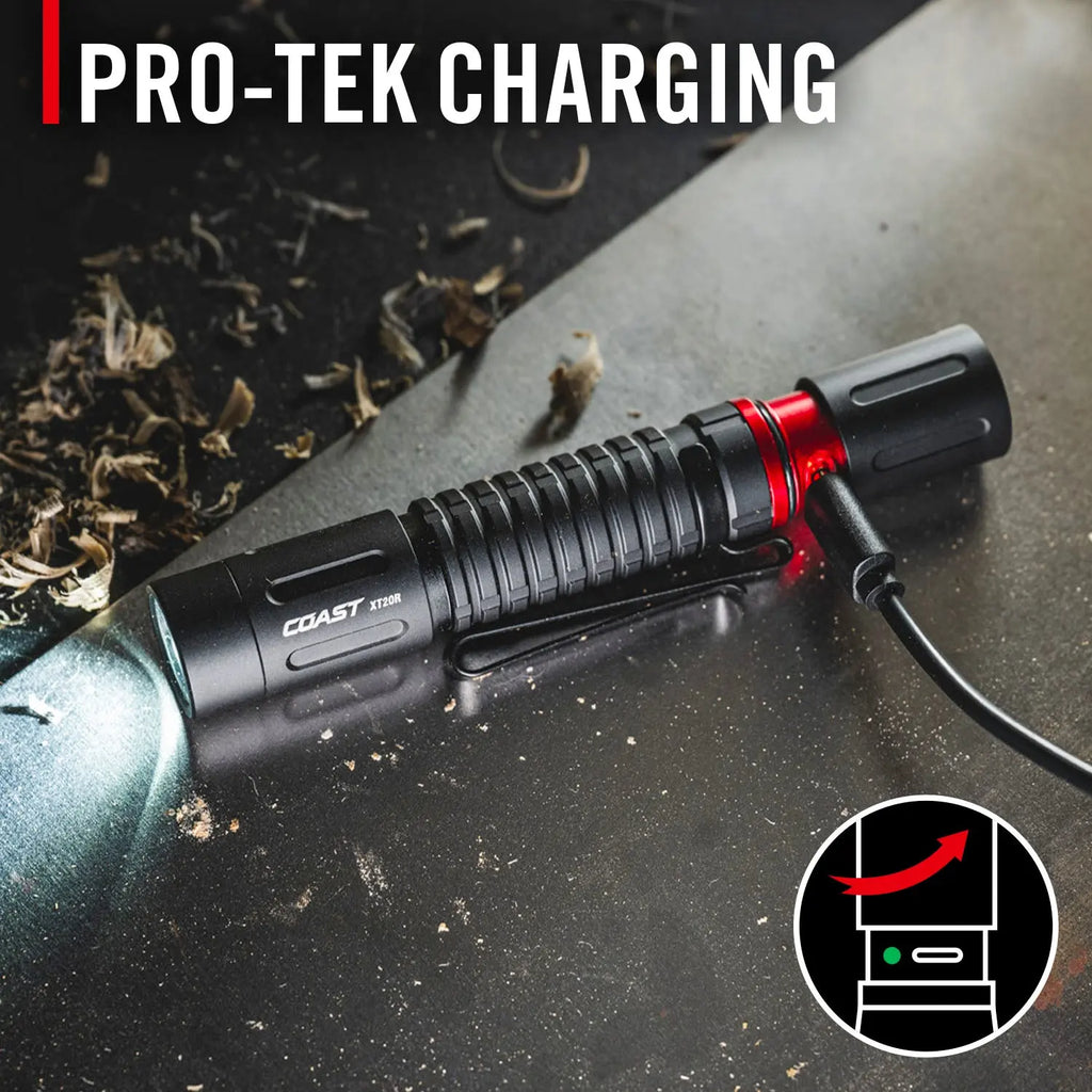 Brighter work is lighter work. Keep the XT20R rechargeable EDC flashlight with you for powerful, packable illumination—whether in the auto shop or on a job site. Peaking at 520 lumens, this four-mode flashlight—medium, high, low, and MoonGlow—provides the light you need without fuss. Adjust the beam to your need using the PURE BEAM optic with TWIST FOCUS, seamlessly transitioning between Ultra View Flood Beam and BULLS-EYE Spot Beam. At just over 8 cm long, the XT20R carries easily in a pants pocket or your tool bag, secured by a two-way pocket clip that also doubles as a hands-free mount for the bill of a hat. Need to hold your light in your mouth? No problem—we designed a durable rubber bite cap that snugs onto the end of the light and protects your teeth during use. Powered by the COAST Rechargeable Plus system, this flashlight delivers long run times from its included rechargeable ZITHION battery or one AA alkaline battery (purchased separately). Recharge the ZITHION battery via the flashlight’s built-in USB-C port. Constructed of top-grade materials, the XT20R is rated IP54 water-resistant and dust-resistant, backed by the COAST lifetime warranty.