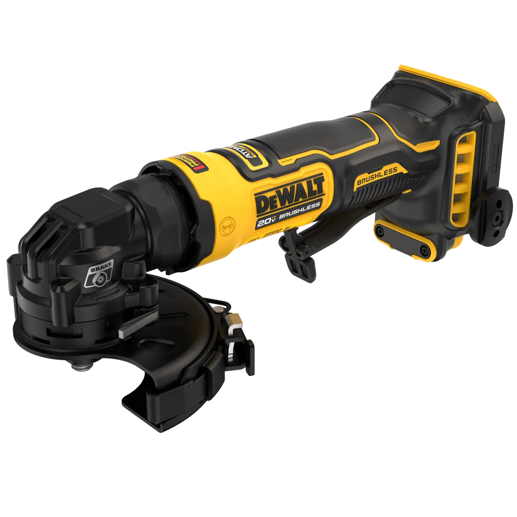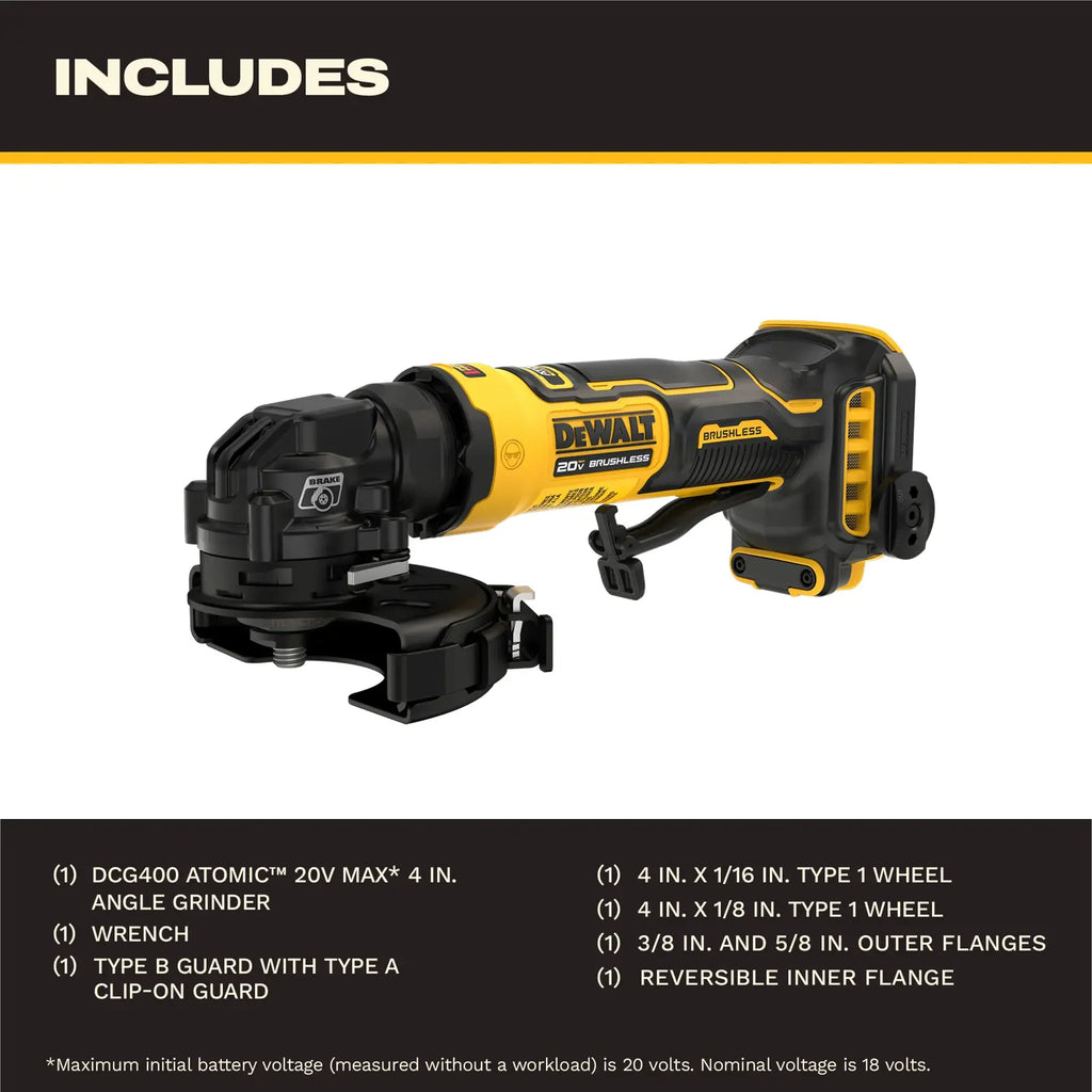 Complete high-powered applications in tight spaces with the ATOMIC™ 20V MAX* 4 in. Angle Grinder (battery and charger sold separately) that delivers optimized maneuverability and 755 MWO. This tool is equipped with the DEWALT® ANTI-ROTATION System to help maximize control. This feature quickly stops the wheel when a pinch, stall, or bind-up event is sensed, reducing reactionary torque. An ergonomic design allows access to ultra tight spaces, while the clip-on guard can quickly convert a Type B guard into a Type A guard. Replace pneumatic angle grinders with this cordless solution that delivers untethered performance, productivity, and pneumatic-like power” .