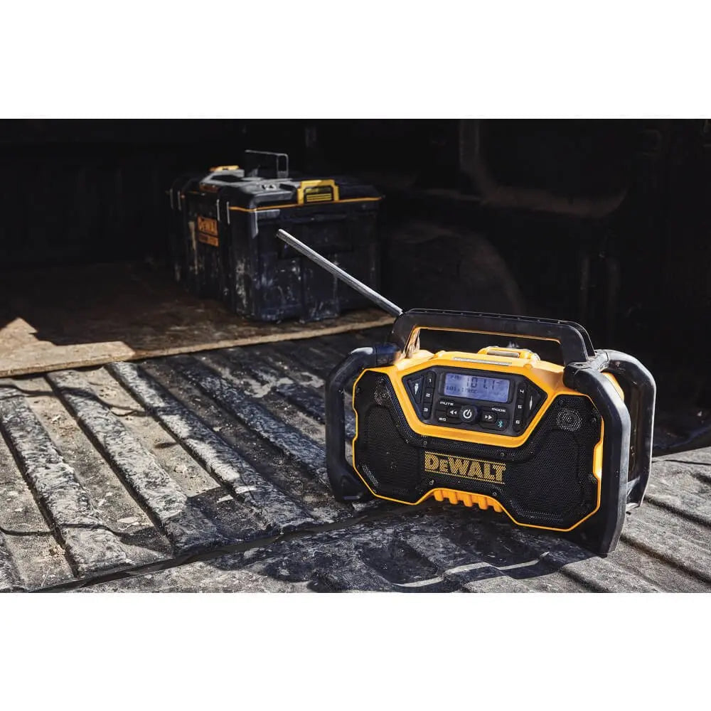 The 12V/20V MAX Bluetooth Jobsite Radio provides premium sound in the toughest work environments. DEWALT radio has durable roll-cage design to withstand drops and impacts. The innovative handle stores and protects the radio antenna when not in use. Quad speakers kick out true stereo sound with deep bass. Stream music via Bluetooth from up to 100 feet, or connect through the built-in auxiliary port. AM/FM radio includes six customizable presets per band. A convenient USB port charges your mobile devices. This cordless jobsite radio includes a detachable AC power cord, or power with DEWALT 12V MAX, 20V MAX, or FLEXVOLT batteries (sold separately). The Bluetooth Radio Speaker includes a 3-year limited warranty.