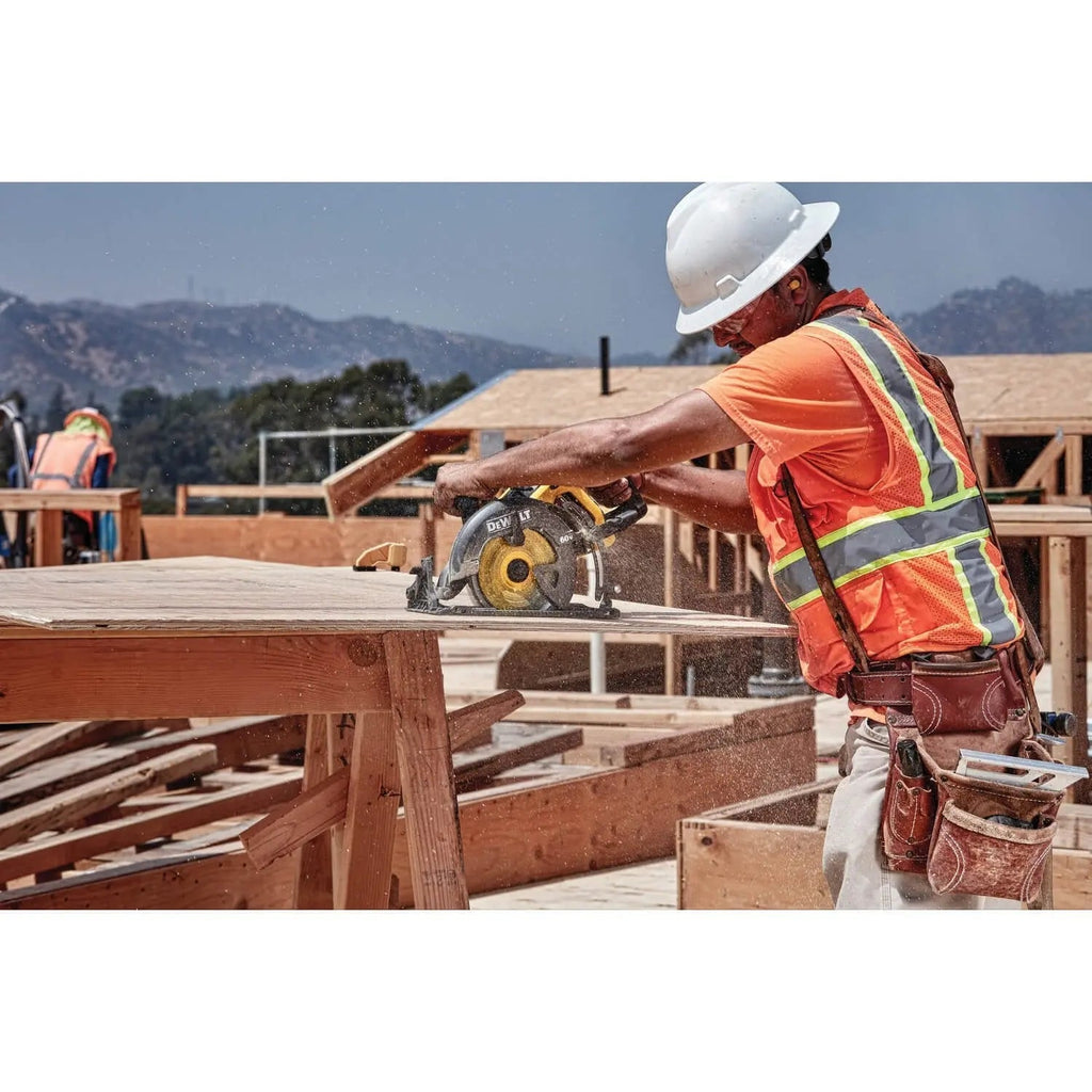 The FLEXVOLT 60V MAX 7-1/4 in. Cordless Worm Drive Style Saw features a blade oriented to the left of the motor and the handle positioned at the rear of the saw to optimize line of sight when cutting. An electronic brake helps stop the blade after the trigger is released. Bevel capacity is 53 with stops at 45 and 22.5. The saw achieves smooth, accurate cuts and long runtime with a durable, high-grade magnesium shoe and an efficient brushless motor.This Cordless Worm Drive Style Saw achieves 2-7/16 in. depth of cut at 90. Hang the tool conveniently with the included rafter hook. This tool is also Tool Connect Tag-Ready so you can easily track it by attaching a Tool Connect Tag (Tag sold separately.) It's ideal for use in a variety of wood cutting applications such as oriented strand board (OSB), plywood, hardwoods, dimensional lumber, and flooring. Many of the professional contractors using this tool include framers, concrete formers, carpenters, and general contractors.DEWALT high powered cordless tools come standard with a 3-year limited warranty, 1-year free service contract and 90-day money-back guarantee. Purchase FLEXVOLT 20V/60V MAX batteries separately.