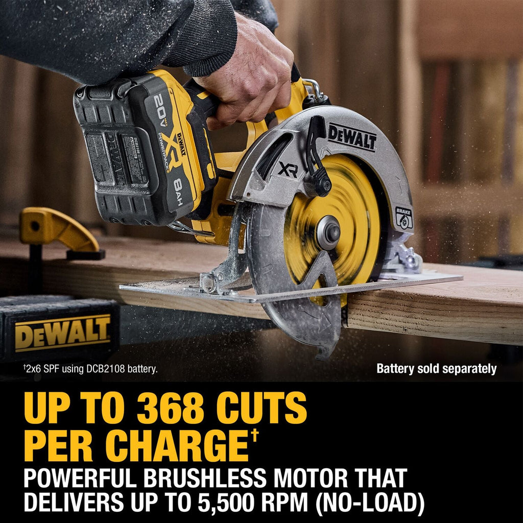 Cut through tough applications with our most powerful 20V MAX* circular saw†. Featuring a powerful brushless motor that delivers up to 1,700 MWO and up to 368 cuts per charge**, the 20V MAX* XR® 7-1/4 in. Circular Saw is designed to make accurate cuts quickly. With a blade oriented to the right of the motor and a top handle position design, this circular saw is built for ease-of-use on challenging jobsites. This saw comes equipped with an electronic brake that helps stop the blade when the trigger is released. This durable, high-performance circular saw provides smooth, accurate cuts and a bevel capacity of 57° with stops at 45° and 22.5°. Battery and charger sold separately.