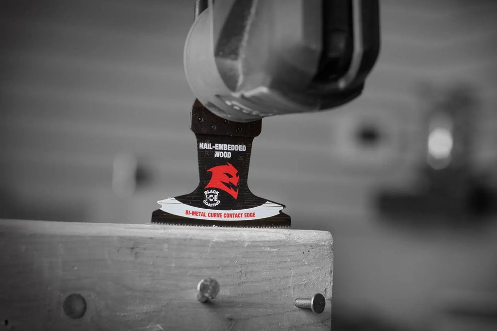 Diablo’s universal fit bi-metal oscillating blades feature application specific designs that deliver maximum durability and longer life in nail-embedded wood applications. These high-performance blades feature an ultra-hardened cutting edge to deliver up to 5X longer life than standard blades. Curve contact edge creates a pilot for precise, clean plunge cuts with less vibration. Black I.C.E. (Industrial Cooling Element) keeps the teeth cool and build up free for fast, clean cuts. The blade’s universal fit, adapter-free design easily attaches most tools, with the exception of Starlock tools.