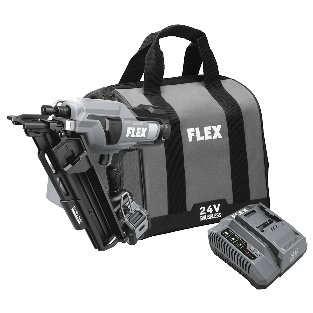 - THE FLEX ADVANTAGE - 20% more power with 24V lithium, 25% longer runtime with THERMA-TECH™ heat management, up to 50% faster charging with high-power, dual fan chargersCORDLESS FRAMING NAILER KIT - Includes the 30° framing nailer, 5.0Ah lithium battery, 160W Fast Charger, and rafter hookEXTENDED RUNTIME - Drives up to 1,100 nails on a single charge with a 5.0Ah batteryHIGH-SPEED POWER - Drives up to 3 nails per second with zero ramp up timePOWER ADJUSTMENT DIAL - Easily sets ideal nailing depthDUAL WORKLIGHT - Dual LEDs light up dark areasDRY FIRE LOCKOUT - Eliminates blank firing after nail supply exhaustedPIVOTING RAFTER HOOK - For easy storage when not in useFLEX 24V CROSS-COMPATIBILITY - Compatible with all FLEX 24V batteries, chargers, and toolsFLEX LIMITED LIFETIME WARRANTY - Register your new FLEX tool, battery, or charger within 30 days of purchase through December 31, 2025 to receive a limited lifetime warranty