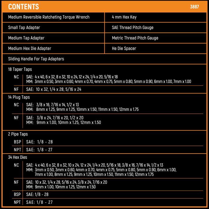 • Warranty : Full Lifetime on Wrenches & Adapters - No Warranty on Taps & Dies