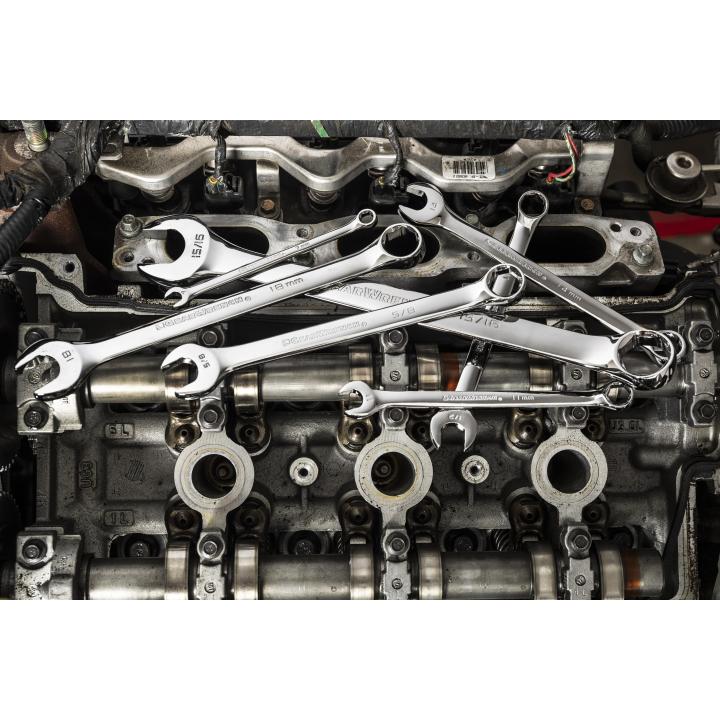The GEARWRENCH combination wrenches are durable tools for most jobs. They are made from alloy steel with either a full polish or satin finish that resists rust & corrosion. The off-corner loading design on both ends provides a stronger grip on fasteners, reduces fastener rounding, and delivers up to 25% more torque to the fasteners. Sizes are stamped on the beam for quick, easy, & permanent identification. The box end is offset 15° for increased access to fasteners. Available in stubby & long pattern lengths and 6 & 12 point, the GEARWRENCH combination wrenches are a must have for every toolbox.
