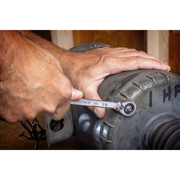 - 90-tooth ratcheting box end delivers a 4° swing arc to turn a fastener in tight spaces