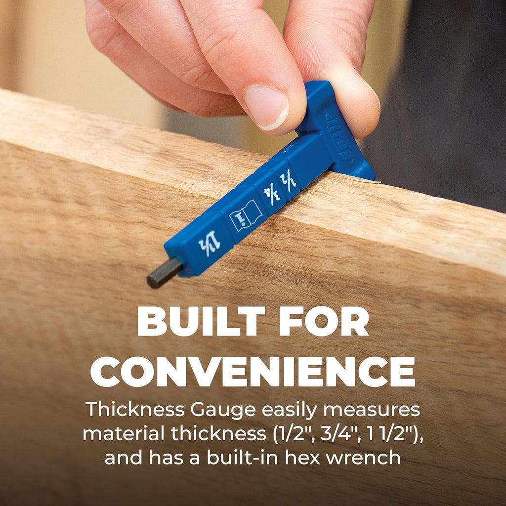 This drill bit works with materials from ½" to 1½" thick, and features engraved markings for ½", ¾", 1½", along with the matching Easy-Set Stop Collar. The Material Thickness Gauge allows you to easily determine material thickness from ½" to 1½" easily, too. A ¼" hex-shank fits all standard quick-change chucks. Compatible with all Kreg Pocket-Hole Jigs.