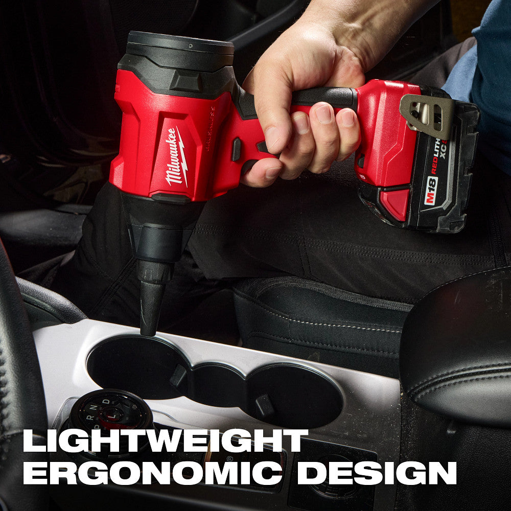 The MILWAUKEE(R) M18(TM) Brushless Precision Blower delivers the Fastest Air Speed for Stubborn Debris, commonly found in hard-to-reach or hard-to-clean places. Equipped with 3 distinct power modes and a variable speed trigger, this high-speed blower offers ultimate control of air performance. On MAX POWER MODE, the Brushless Motor delivers 570 MPH and up to 39 CFM, providing the power to clear stubborn jobsite debris effectively. With an M18(TM) REDLITHIUM(TM) XC5.0 battery pack in MAX RUN-TIME MODE, this blower delivers over 30 minutes of run-time, ideal for common job site tasks. With a unique form factor, this handheld, compact blower is only 7" long and 2 lbs, ergonomically designed for convenient cleanup in various environments. Equipped with an integrated LED light to illuminate work surfaces, this tool provides greater visibility when cleaning dimly lit spaces. The tool has a trigger lock-on switch to reduce user fatigue in extended cleanup applications. There are (3) kitted interchangeable nozzles for added versatility: a short 6mm nozzle, a long 10mm, and an inflator nozzle. All nozzles are made of a durable rubber material designed for cleaning in sensitive applications and are easily interchangeable with a quarter-turn design. The kitted nozzle holder has magnets, hang holes, and a lanyard loop for convenient and versatile storage. This tool also includes a removable Inlet Filter (49-90-1949), which is critical for containing debris and tool longevity.