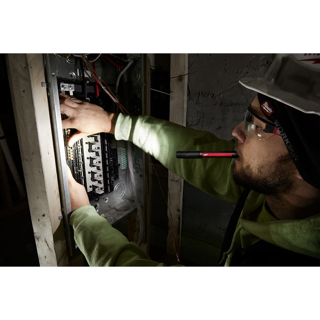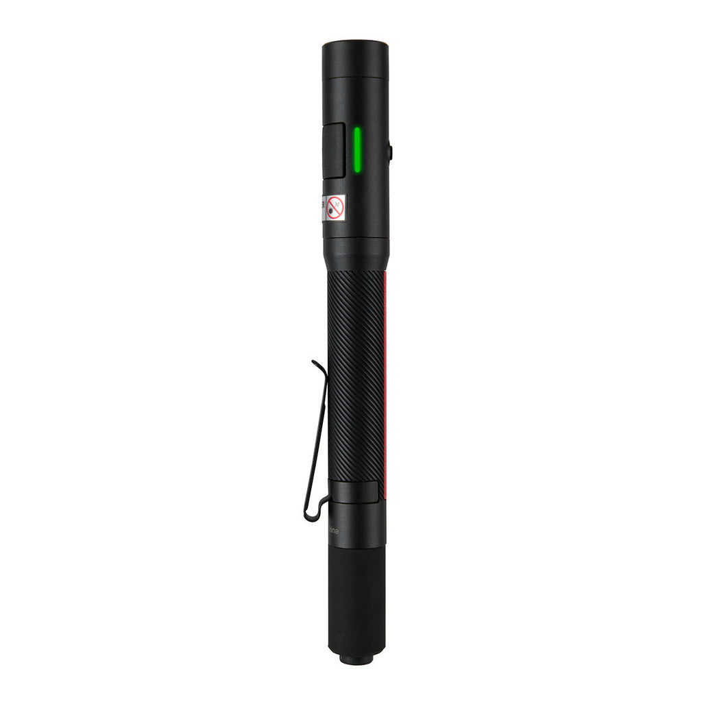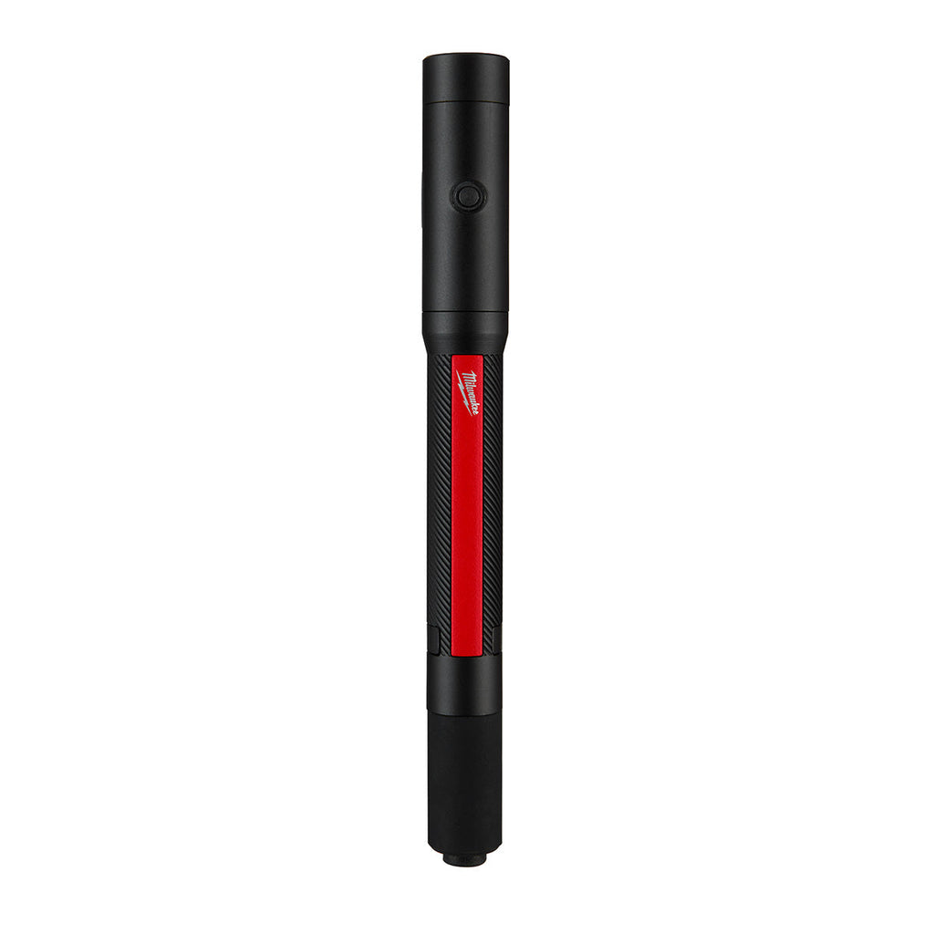 The MILWAUKEE® Rechargeable 250L Penlight w/ Laser offers faster, more accurate inspections. This rechargeable penlight delivers 250 lumens of TRUEVIEW HIGH DEFINITION OUTPUT, and an integrated laser pointer ensures faster inspections and accurate communication on the jobsite. A built-in protective rubber bite zone allows for quickly directing light while performing two-handed tasks. With two output modes, get the optimal light or run-time up-to 8 hours for any task. Stay ready from job-to-job with USB charging and an on-board battery indicator. The removable metal clip offers a secure attachment to shirts or pant pockets for reliable storage. This penlight with laser pointer is built to survive the toughest jobsite conditions with an IP67 water and dustproof rating and withstands impacts up to 2 meters. The Milwaukee Rechargeable 250L Penlight w/ Laser's built-in battery gives high performance and rechargeable capabilities where compact size is critical. The Milwaukee Rechargeable 250L Penlight w/ Laser is covered by a 2-year warranty.