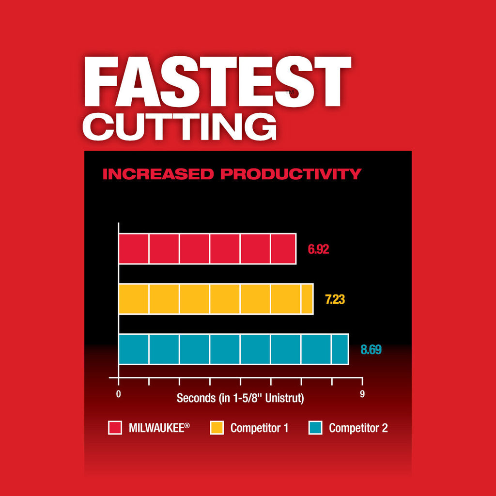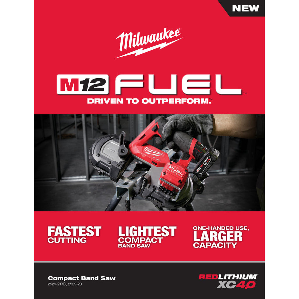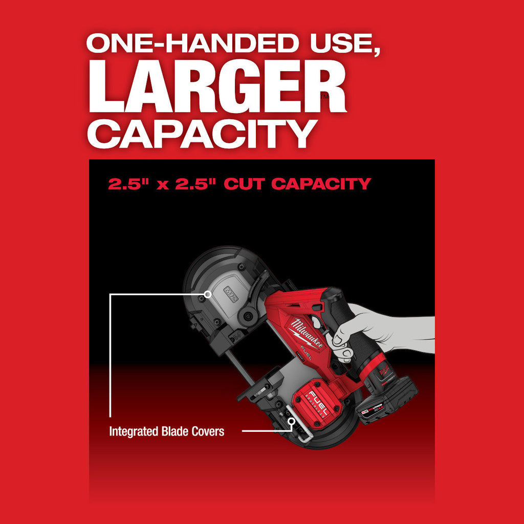 The MILWAUKEE® M12 FUEL™ Compact Band Saw utilizes a POWERSTATE™ Brushless Motor and Constant Power Technology™, making it the fastest cutting compact band saw in Unistrut with a cut capacity of 2-1/2” X 2-1/2”. The M12 FUEL™ Compact Band Saw offers a compact design and weighs only six pounds, making it the lightest compact band saw on the market. The M12 FUEL™ Compact Band Saw offers integrated blade covers, making it suitable for one-handed use while offering a larger capacity than the existing M12™ Sub-Compact Band Saw. The improved performance, lightweight design, one-handed capability, and increased capacity enhance productivity while lowering fatigue. The compact, portable band saw is equipped with Jobsite Armor Technology™, a proprietary composite material to better protect it from drops and debris and crush zone barriers that absorb impacts. A variable speed trigger and an LED work light provide maximum control. An integrated rafter hook allows for easy storage in-between cuts. The M12 FUEL™ Compact Band Saw is also compatible with the band saw reamer attachment (49-90-2029, sold separately), which easily attaches to the back of the tool, providing the ability to cut and ream with the same tool. One 12/14 TPI Extreme Metal Blade is included.