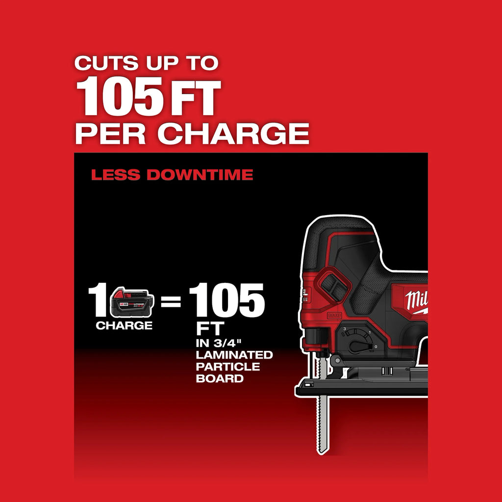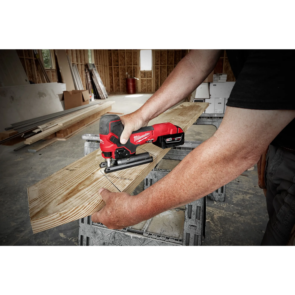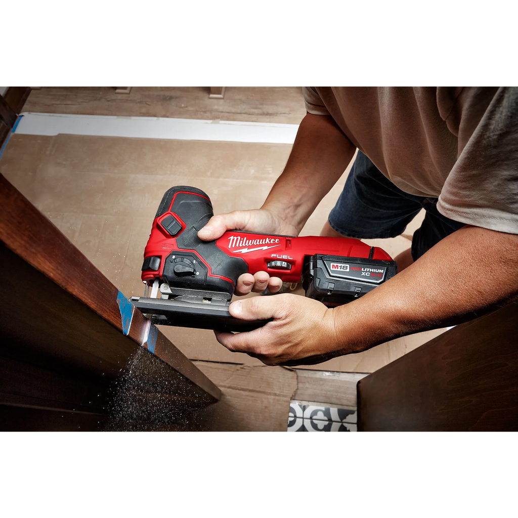 The M18 FUEL™ Barrel Grip Jig Saw combines power, blade speed and precision, to provide the highest quality cuts in a wide variety of materials. The M18 FUEL™ Barrel Grip Jig Saw leverages the POWERSTATE™ Brushless Motor and REDLINK PLUS Intelligence to provide higher blade speed than corded jig saws at 3500 strokes per minute for clean controlled cuts with minimized chipping or bucking. Leveraging the M18™ REDLITHIUM™ XC5.0 battery the M18 FUEL™ D-Handle Jig Saw provides up to 105 linear feet of cutting in ¾” laminated particle board, delivering all day productivity with less trips to the charger. The saw features tool-less blade change, tool free bevel adjust with detents at 0°; 15°; 30°; and 45° as well as an LED light and on/off blower to keep the cut line visible while cutting.