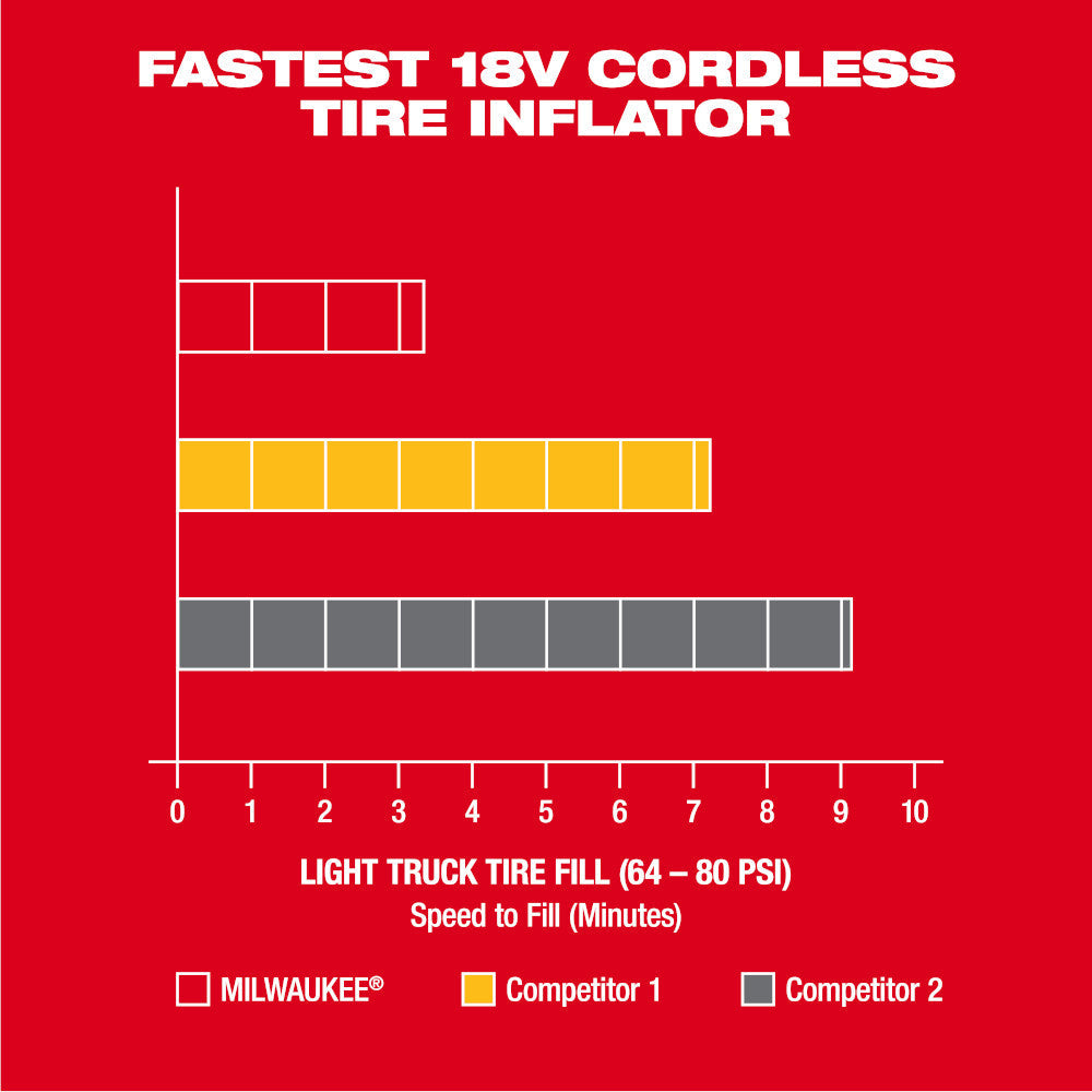 MILWAUKEE® FASTEST 18V CORDLESS TIRE INFLATOR. The MILWAUKEE® M18™ Inflator delivers fast, accurate, easy inflation with the portability to take anywhere. Optimized for passenger, light truck, and other medium-duty tires. Rated to deliver max 150PSI, the high-efficiency motor tops-off 33” light truck tires in under 1 minute. The TrueFill™ Technology features an auto-pressure check that is designed to WAIT for the pressure to stabilize, CHECK the system pressure, and FILL until the desired target is reached. In addition, an Auto Shut-Off feature will stop inflation at selected PSI to prevent overinflation allowing users to set it & forget it. Furthermore, the unit includes 4 PSI memory slots, anti-vibration feet, a 36” inch hose with an all-brass Schrader chuck, and an on-board hose and nozzle storage.