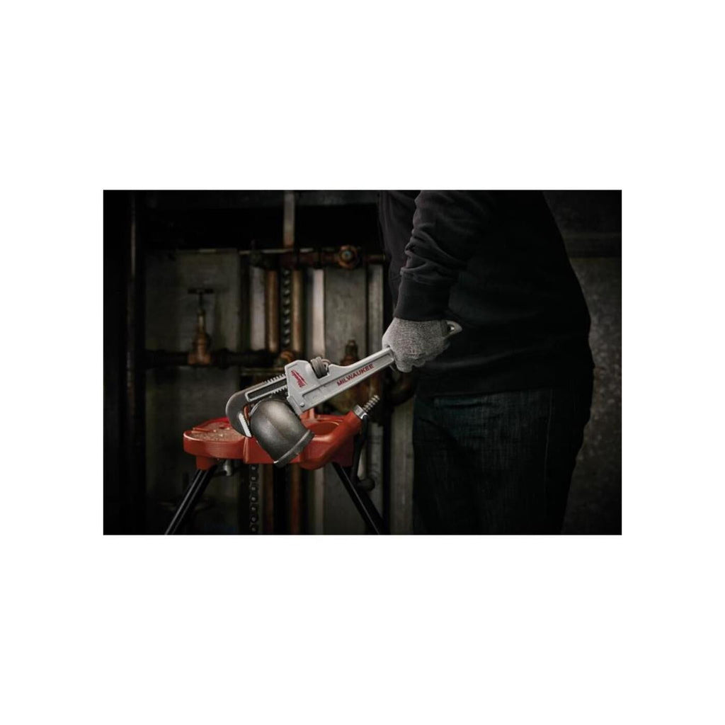 The Milwaukee 14 in. aluminum pipe wrench has been designed from the ground up to offer maximum productivity to the professional user. The 14 in. aluminum pipe wrench features and overbite jaw design offering the largest gripping surface. Dual coil springs offer maximum durability and tool life, and the ergonomic handle form has been designed for maximum comfort and won’t dig into the palms. Through hardened jaws deliver increased grip and tooth durability, and a tether-ready handle loop makes the Milwaukee 48-22-7214 perfect for the toughest of jobsites. Milwaukee stands behind their product and offers a Limited Lifetime Warranty with all pipe wrenches.