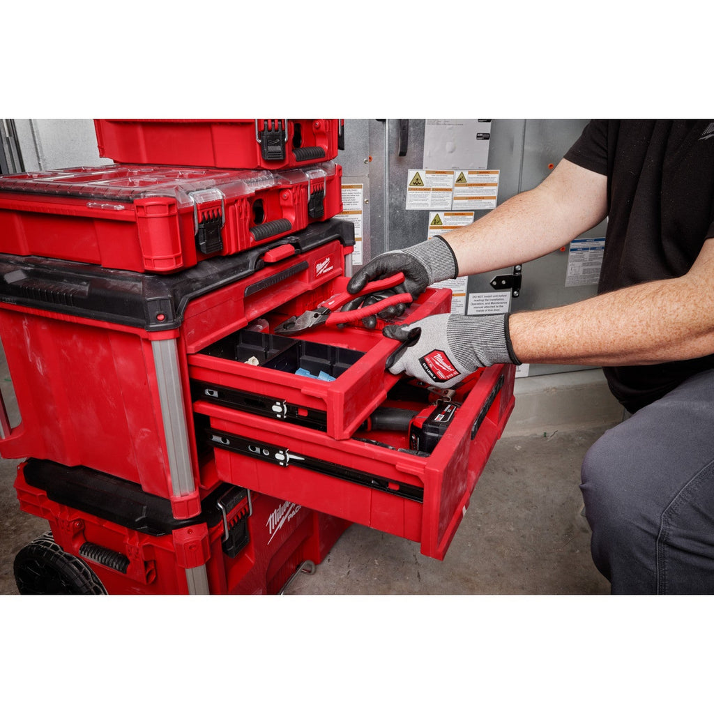 The MILWAUKEE® PACKOUT™ Multi-Depth 3-Drawer Tool Box has a 50lbs weight capacity and a locking security bar that allows you to padlock the drawers closed, keeping them securely shut during transport. As part of the MILWAUKEE® PACKOUT™ Modular Storage, the 3-Drawer Tool Box allows you to customize your storage system for easy transportation and organization of tools and accessories. This portable tool box with drawers is constructed with impact-resistant polymers, all-metal ball-bearing slides, and metal-reinforced corners for ultimate jobsite durability. The Multi-Depth 3-Drawer Tool Box also allows you to customize your drawer layout with Quick-Adjust Dividers (includes 3 sets of dividers). The PACKOUT™ Modular Storage System is the industry's most versatile and durable storage system.