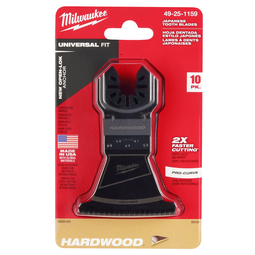 Our OPEN-LOK™ HCS Japanese Tooth PRO-CURVE™ Hardwood Oscillating Multi-Tool Blades are made from premium high carbon steel and feature precision triple-ground Japanese teeth for up to 2X faster cuts than the previous generation of high carbon steel blades. The Japanese Tooth hardwood blades have a PRO-CURVE™ cutting edge for greater control and accuracy while cutting. The combination of Japanese Teeth and PRO-CURVE™ cutting edge make this blade the optimal solution for precise cuts with a smooth finish in hardwood, wood, PVC, drywall, and other soft materials. These blades feature a reinforced Universal Fit OPEN-LOK™ anchor for better strength & control and allow for quick blade changes across 100+ multi-tools. Not compatible with Starlock tools. MILWAUKEE® oscillating multi-tool blades are designed and made in the USA with global materials.