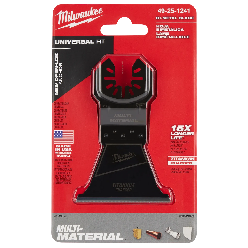 Our Universal Fit OPEN-LOK™ TITANIUM CHARGED™ Bi-Metal Multi-Material Blades are made from premium high-speed steel. These bi-metal blades are ideal for cuts in wood, nails, PVC, and drywall. TITANIUM CHARGED™ Bi-Metal blades have an optimized titanium blend for maximum wear-resistance and up to 15x longer life vs. high carbon steel (HCS) blades. These blades feature a reinforced Universal Fit OPEN-LOK™ anchor for better strength & control and allow for quick blade changes across 100+ multi-tools. Not compatible with Starlock tools. MILWAUKEE® oscillating multi-tool blades are designed and made in the USA with global materials.