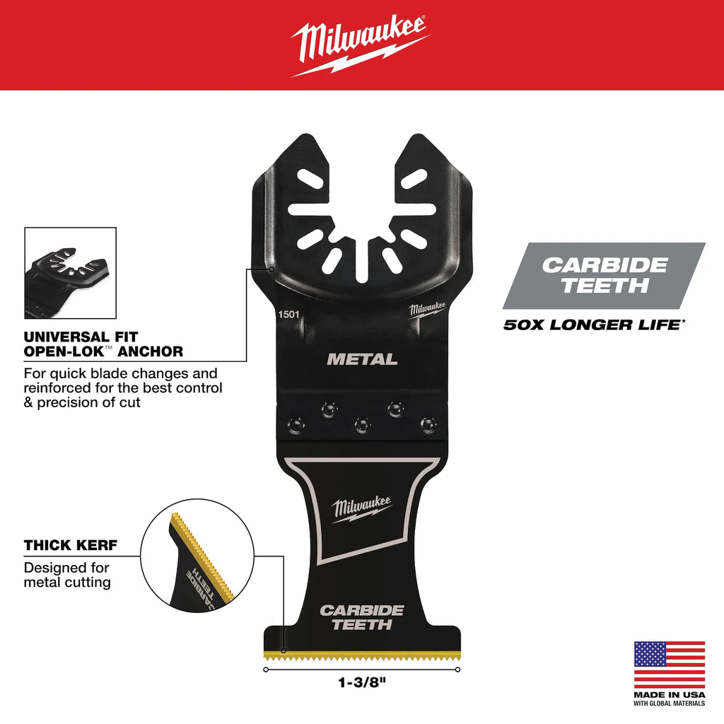 Our Universal Fit OPEN-LOK™ 1-3/8" Carbide Teeth Metal Multi-Tool Blades are designed for metal cutting in screws, bolts, nails, and more. Carbide Teeth blades last up to 50X longer than standard bi-metal blades and can be used in a wide range of materials while maintaining longer blade life. These blades feature a reinforced Universal Fit OPEN-LOK™ anchor for better strength & control and allow for quick blade changes across 100+ multi-tools. Not compatible with Starlock tools. MILWAUKEE® oscillating multi-tool blades are designed and made in the USA with global materials.
