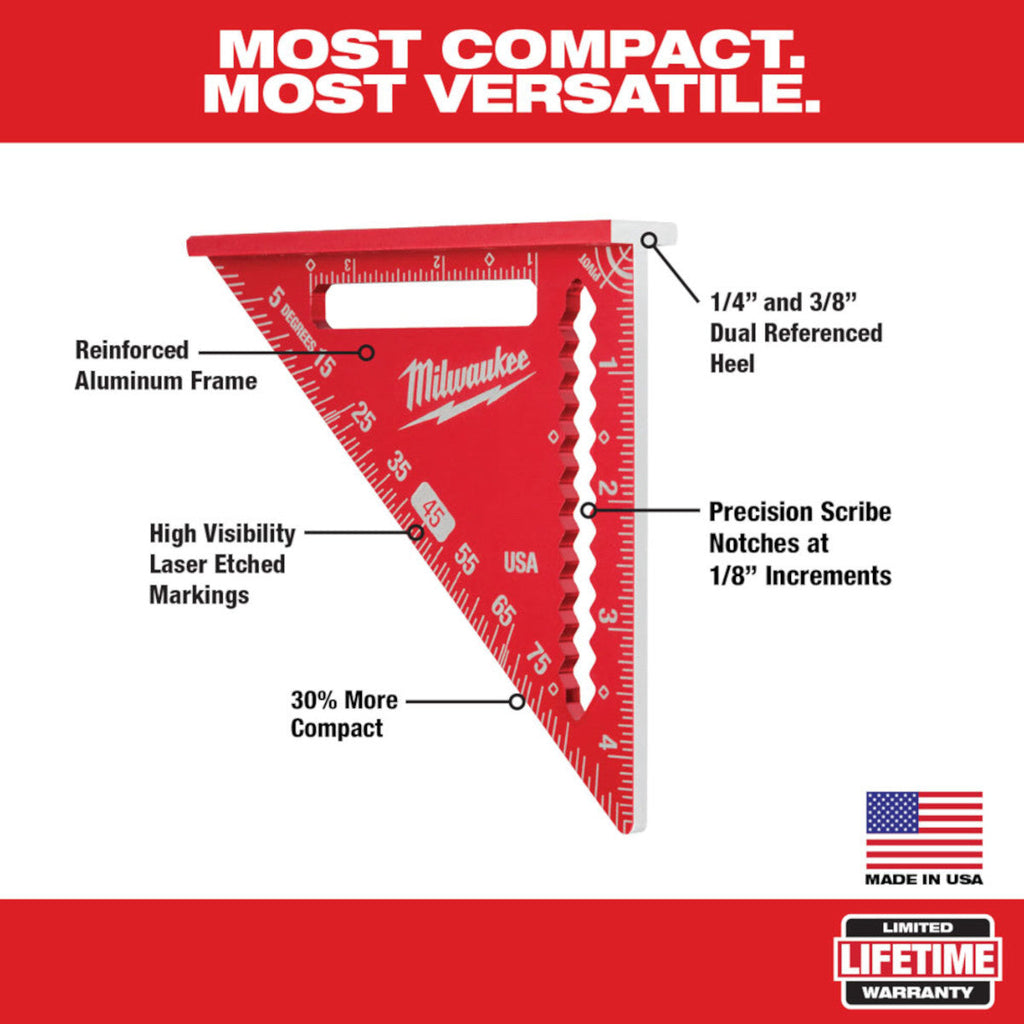The new Milwaukee 4-1/2 in. trim square is an everyday carry layout solution. With its 35% more compact size it fits easily into pockets, pouches, and tight work spaces. High visibility laser etched markings will not wear off, providing trusted accuracy throughout the life of the square, while a 1/4 in. & 3/8 in. dual measurement heel allows for quick marks.