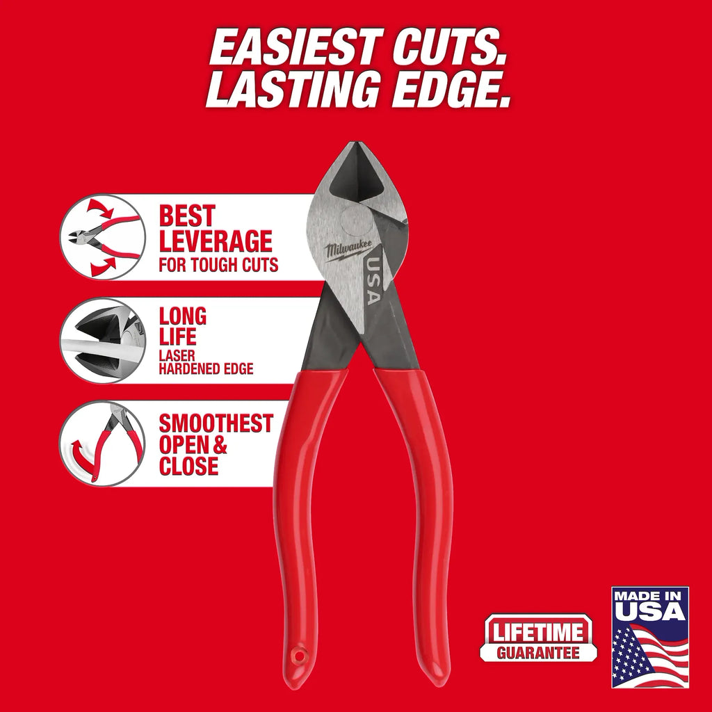 Our Milwaukee® Diagonal Cutting Pliers (USA) deliver the easiest cuts and a lasting edge for the professional user. Our pliers are designed with an optimized pivot point to provide the best leverage for tough cuts through materials like wires, screws, and other common hardware. Our diagonal cutting pliers deliver the confidence of a long cut life with a laser-hardened edge. Our diagonal cutting pliers are engineered to deliver the smoothest open and close experience from the start, with no break-in period required. The pliers are tether ready and offered in both dipped grip with a split-ring hole and comfort grip with a lanyard hole. Our Diagonal Cutting Pliers are available in sizes of 6-inch, 7-inch, and 8-inch. Our Milwaukee Diagonal Cutting Pliers are made in USA with best-in-class manufacturing technology and USA-sourced materials, including durable, press-forged steel, and are backed by a complete Lifetime Guarantee.