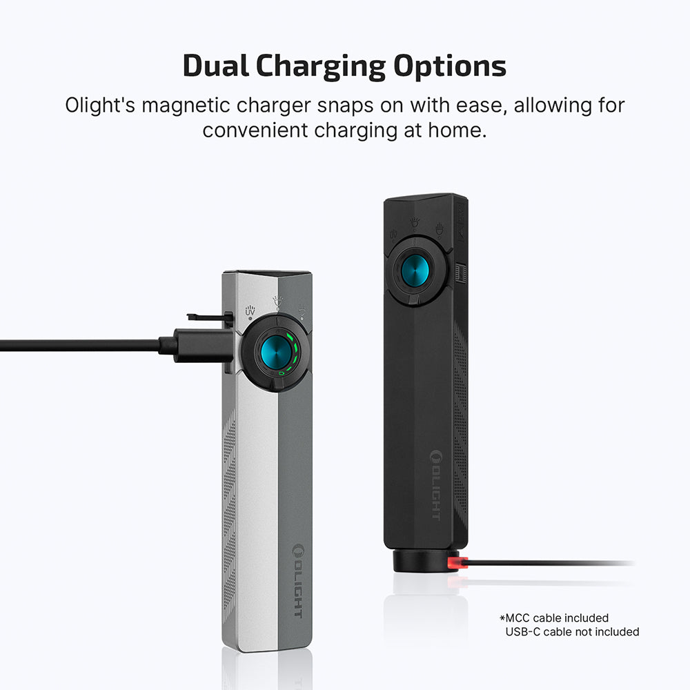 • Easy Charging & Operation: ArkPro's dual charging via USB-C and Magnetic Dock breaks through traditional constraints, easily switching between the three lighting modes using the intuitive circular selector with a dedicated green beam button for flexible use.